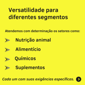 Atendemos com determinação os setores como nutrição animal, alimentício, químico e suplementos — cada um com suas exigências específicas.